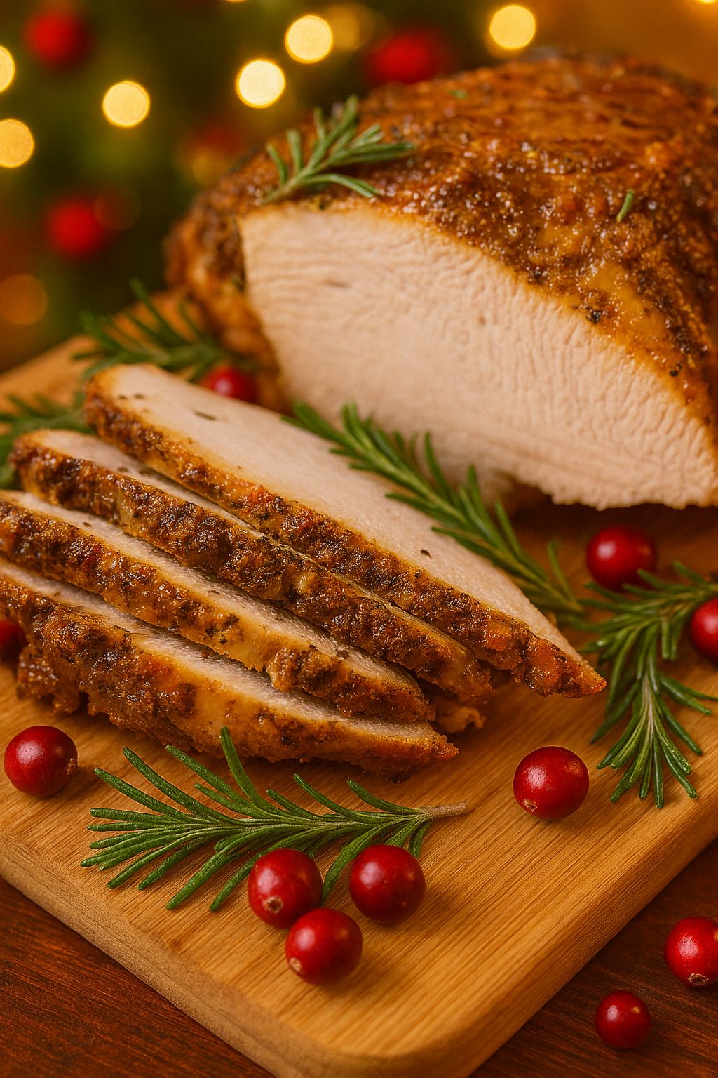 8 – Fatiar o peito de peru e servir, vertendo o molho por cima.